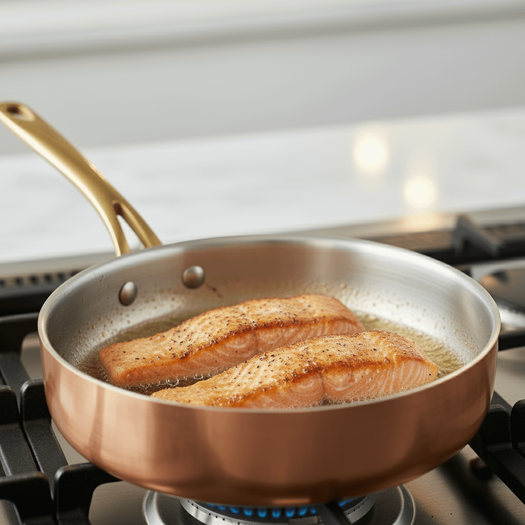 • Sear Salmon: Heat the olive oil in a large skillet (cast iron is great) over medium-high heat. Once shimmering, place the salmon fillets flesh-side-down. Sear for 3-4 minutes, undisturbed, until a golden-brown crust forms.