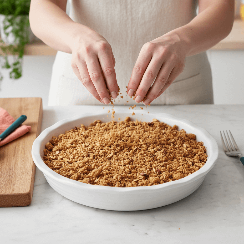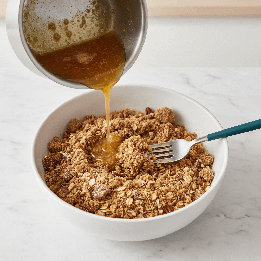 Finally, make the crumble and assemble! We’ll mix our dry ingredients, pour in that glorious brown butter, and toss it until a crumbly topping forms.