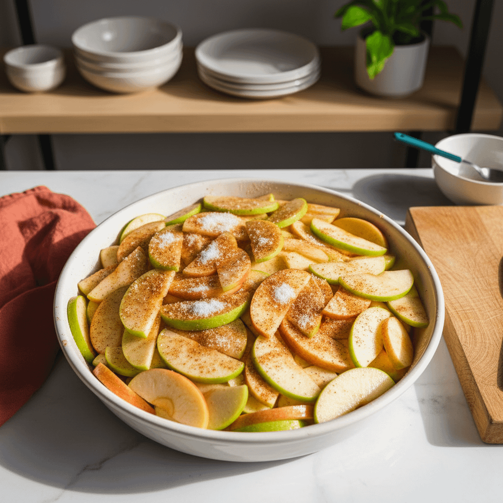 Next, prepare your apple filling. We’ll slice the apples and toss them with a little sugar, lemon juice, and cinnamon right in the baking dish.