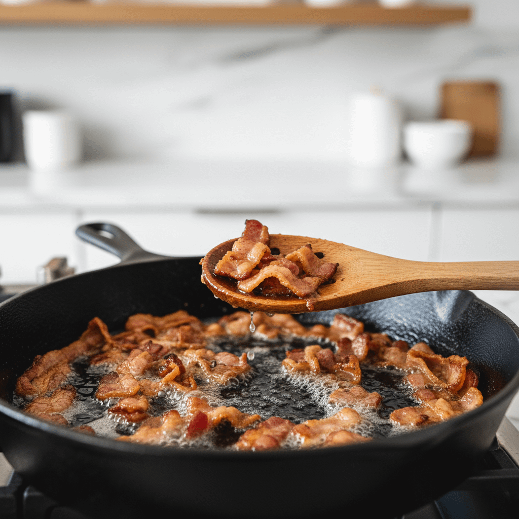 Next, we’ll crisp the bacon. We’ll start by slowly rendering our bacon in a cold pan. This makes it perfectly crispy and, most importantly, creates that flavorful fat that will be the base for our entire jam.