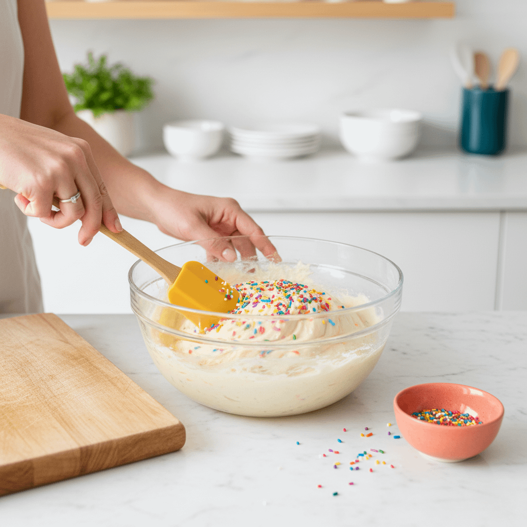 Now for the best part: the “sprinkle!” Pour those colorful sprinkles into your beautiful, soft dough. Use a spatula to gently fold them in. Instant happiness!