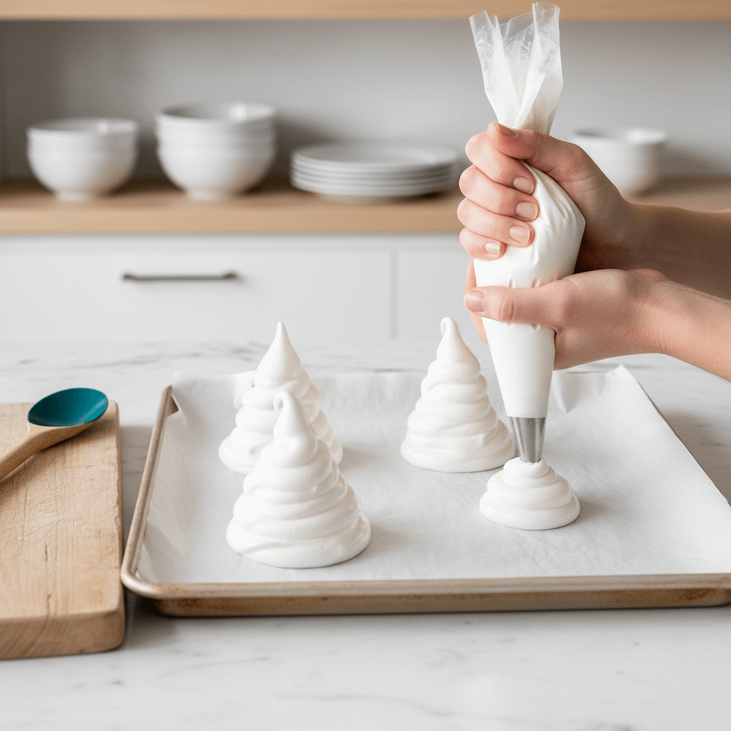 Now, pipe your ghosts. Transfer that beautiful meringue to a piping bag and pipe tall, ghostly swirls onto your baking sheet. Give them a little tail at the top!
