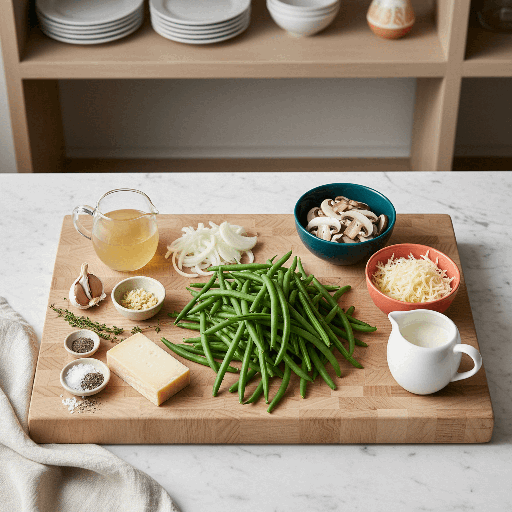 • Combine & Assemble: Remove the sauce from the heat. Add the blanched green beans to the skillet and toss gently to coat them in the creamy mushroom sauce. Taste and adjust seasoning if needed. Pour the mixture into a 9×13 inch baking dish (or a similar 2.5-3 quart casserole dish). If using, sprinkle the optional Parmesan/Gruyère cheese over the top.