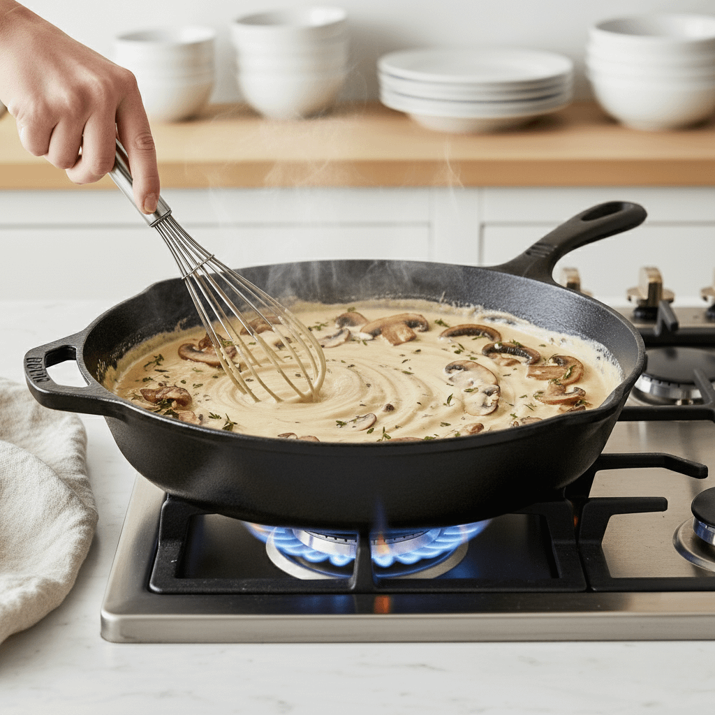 Now, build that luscious mushroom cream sauce. In the same pan, we’ll sauté fresh mushrooms until deeply browned, then create a simple, creamy sauce with broth, cream, and herbs. This is the heart of our casserole.