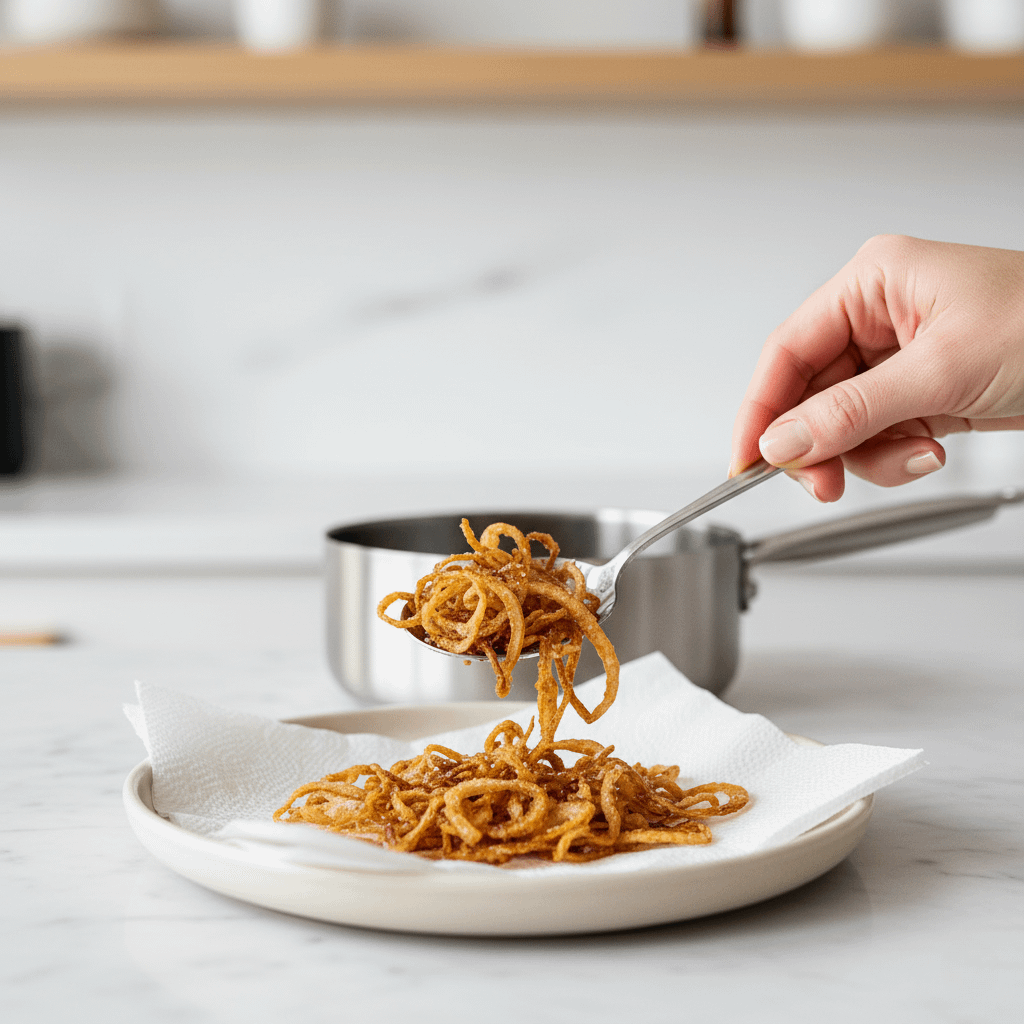 Next, the crispy shallot magic. We’ll thinly slice shallots and fry them gently until they’re deep golden brown and unbelievably crispy. Set these aside – they’re our grand finale “sprinkle.”