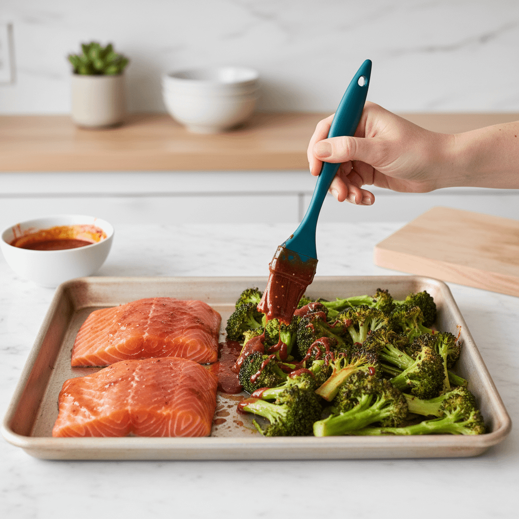 Finally, add the salmon and glaze everything. After the broccoli has had its head start, push it to one side of the pan, add your salmon, and brush that gorgeous glaze all over everything. Pop it back in the oven for a few minutes to finish cooking. A final “sprinkle” of fresh herbs and lemon zest, and dinner is served!