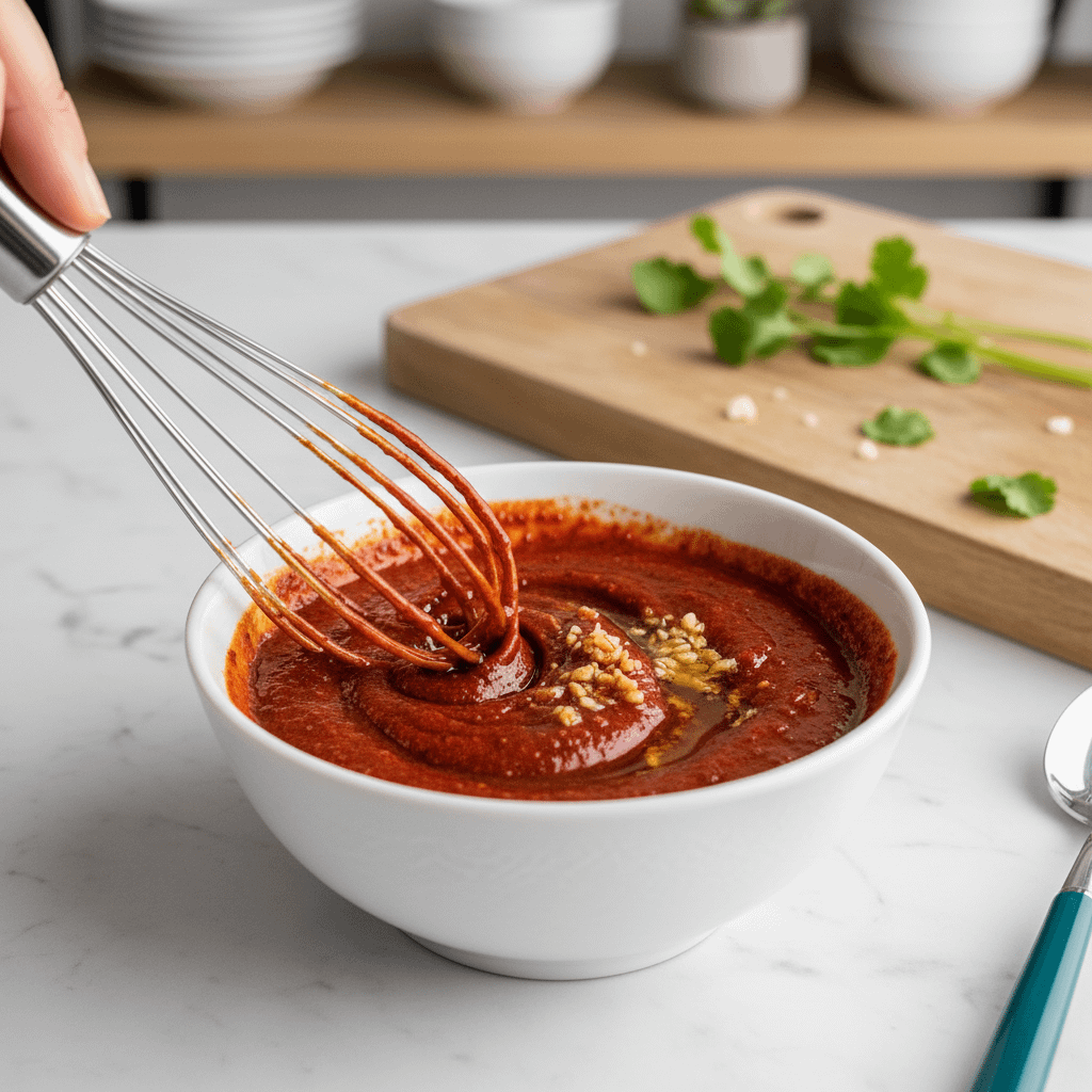 Next, we’ll make our quick hot honey harissa glaze. This is the flavor bomb that brings the whole dish together. Just whisk a few simple ingredients in a bowl!