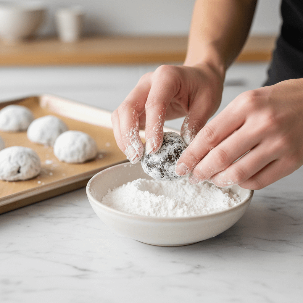 It’s time to roll! This is the fun, messy, part. We’ll roll our chilled dough into balls, then give them a very generous coating in powdered sugar. Don’t be shy – the thicker the coating, the better the crinkle!
