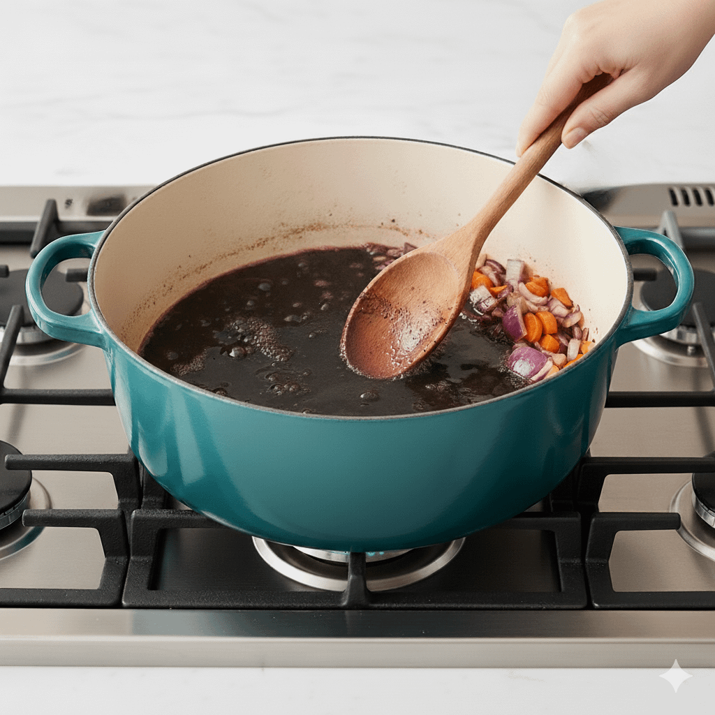 Now, we’ll build our sauce base. In that same pot, we’ll soften our vegetables, then add tomato paste and red wine to build a rich, complex base for our braising liquid.