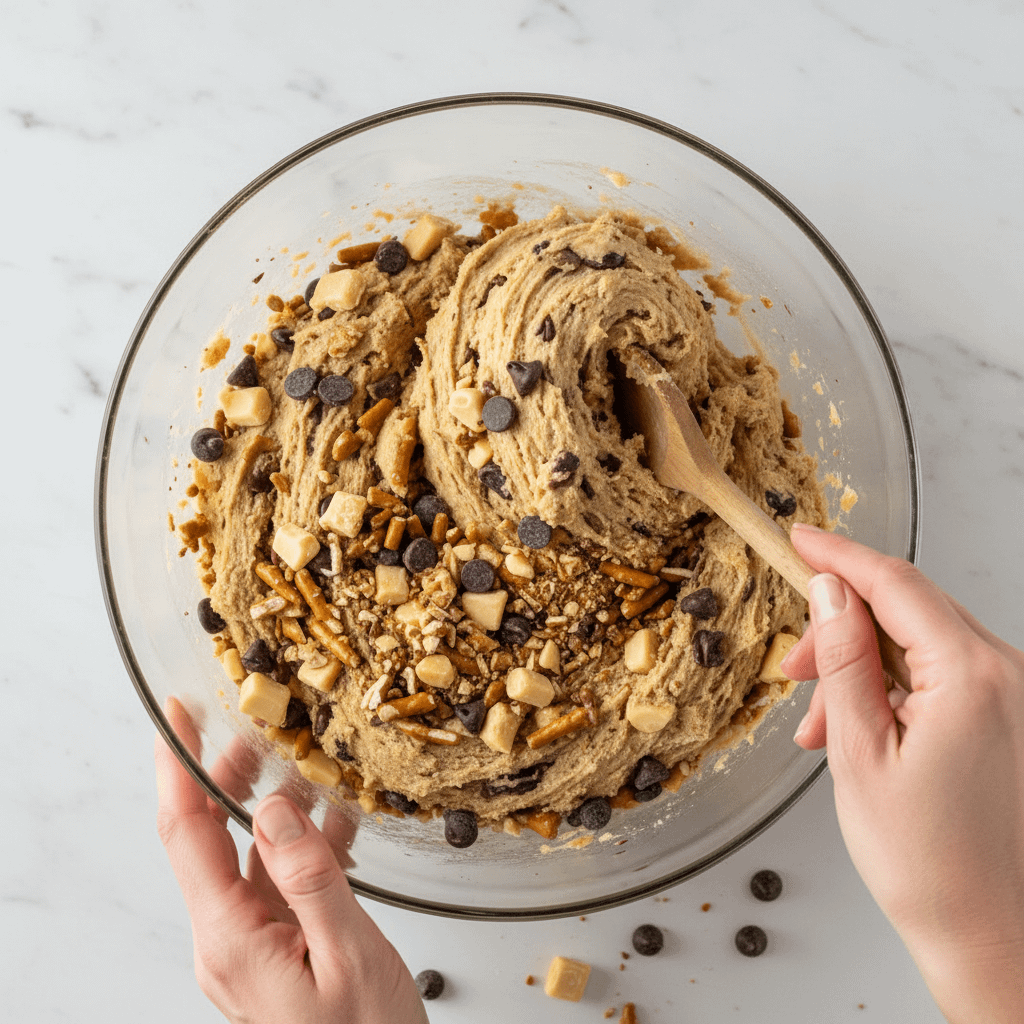 • Add Mix-Ins: Gently fold in the chocolate chips, chopped caramels, and crushed pretzels until they are evenly distributed.