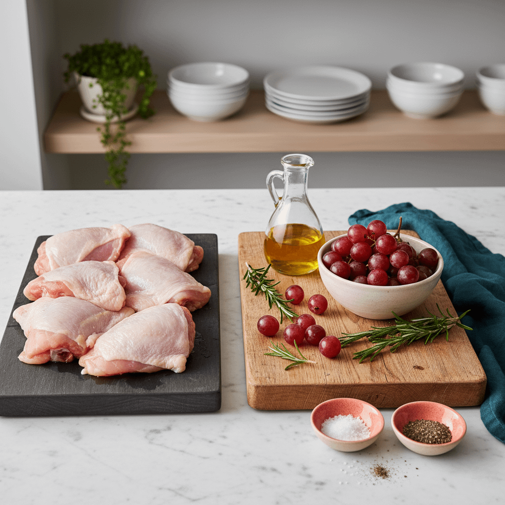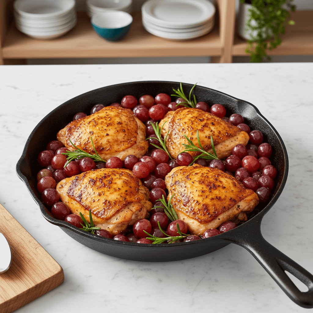 • Assemble the Pan: Flip the chicken over. Scatter the grapes and rosemary sprigs into the skillet, tucking them in between the chicken pieces.