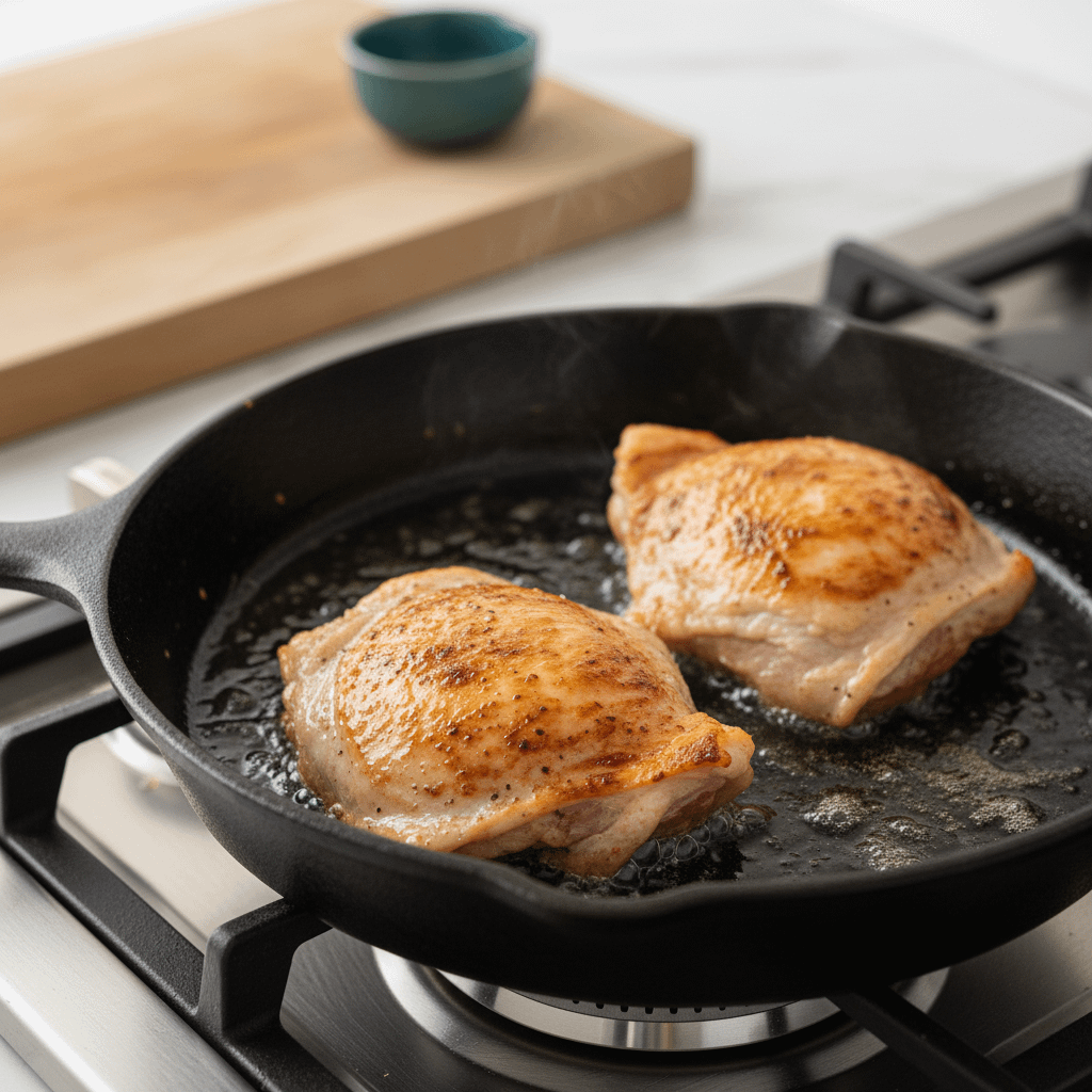 Next, we’ll give the chicken a really good sear. This is the most important step for getting that super crispy, irresistible skin. We’ll get our skillet nice and hot and sear the chicken, skin-side down, until it’s deeply golden brown.