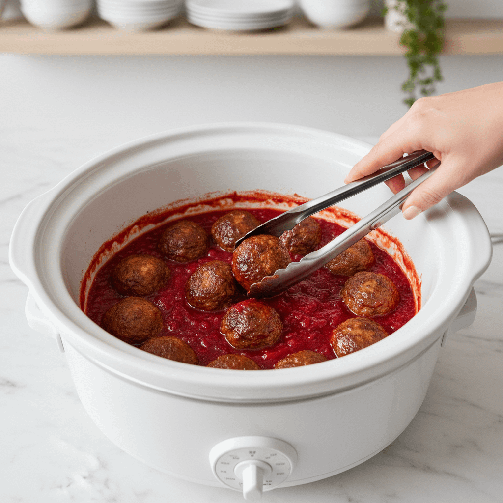 • Slow Cook: As the meatballs are browned, transfer them directly into the sauce in the slow cooker. Once all the meatballs are in, gently stir to coat them in the sauce. Cover and cook on LOW for 2-3 hours or on HIGH for 1-1.5 hours, until the meatballs are cooked through and the sauce is bubbling.