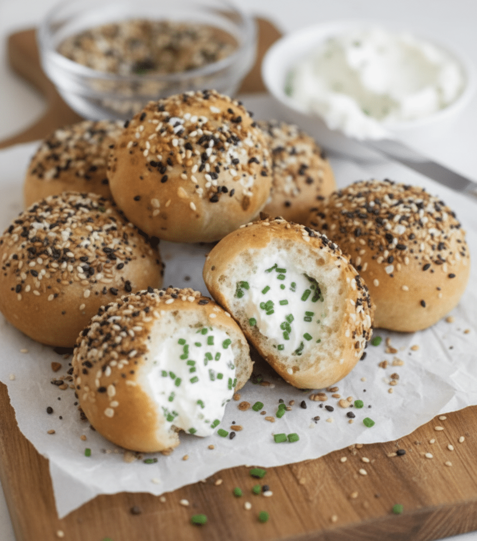 We’re taking that impossibly simple, no-yeast, no-boil dough and giving it the full “Smash & Sprinkle” upgrade. We are stuffing it with a savory scallion cream cheese before we bake it, then giving it a generous sprinkle of our 5-Minute Everything Bagel Spice for that classic, crunchy, garlicky crust.