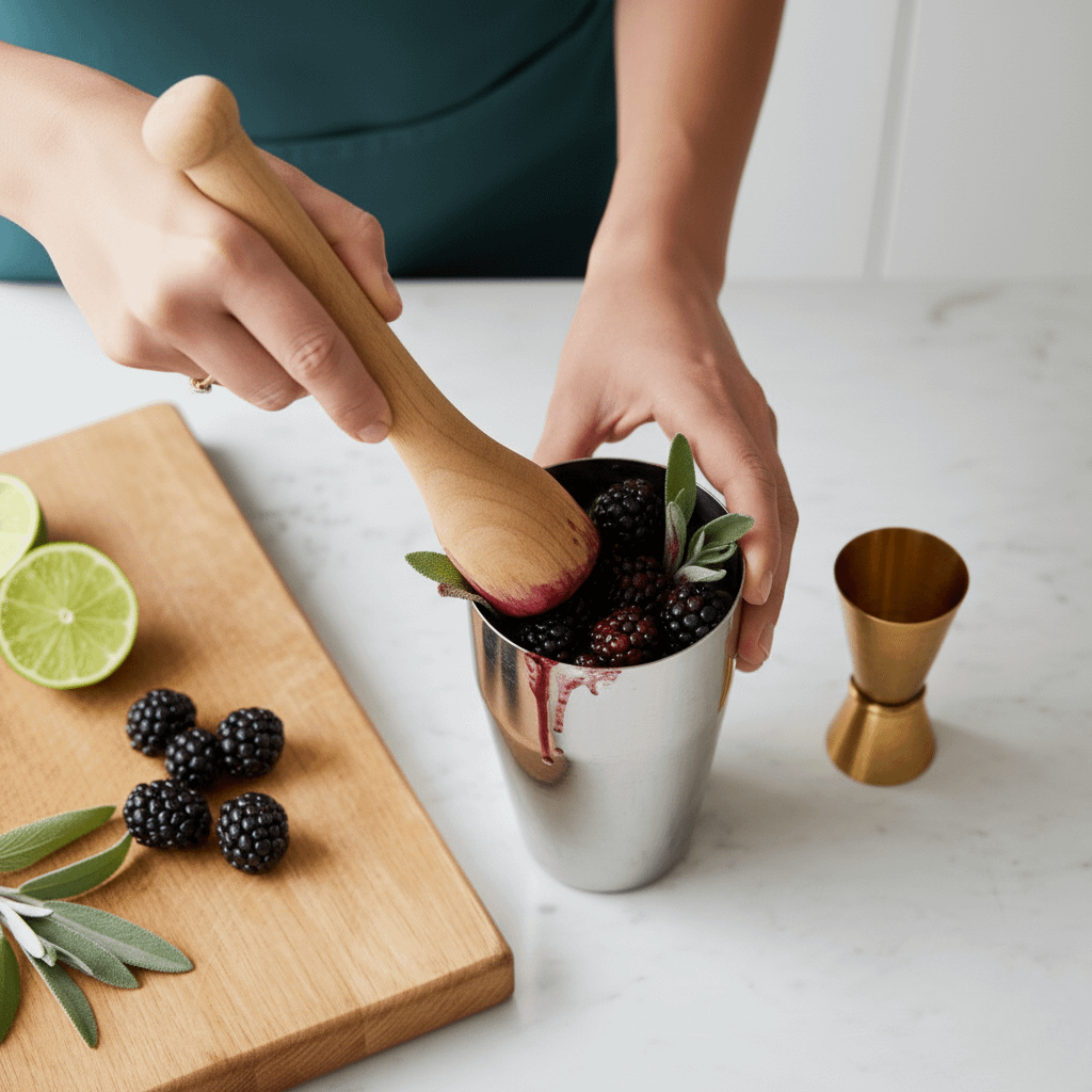 Next comes the fun part: the “smash!” In a cocktail shaker, we’re going to muddle the blackberries, sage leaves, and a little lime juice. This step crushes the fruit and herbs to release all their incredible flavor and create that gorgeous color.